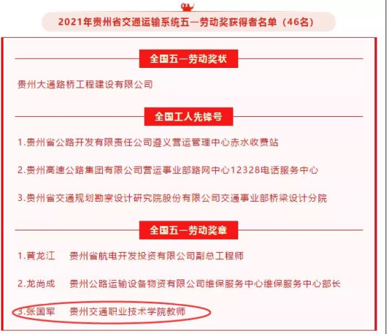 前不久,中华全国总工会对2021年全国五一劳动奖和全国工人先锋号进行了表彰,我院汽车工程系教师张国军喜获全国五一劳动奖章。5月8日,张国军在省交通运输系统五一劳动奖章获得者交流座谈会上作为代表交流发言。