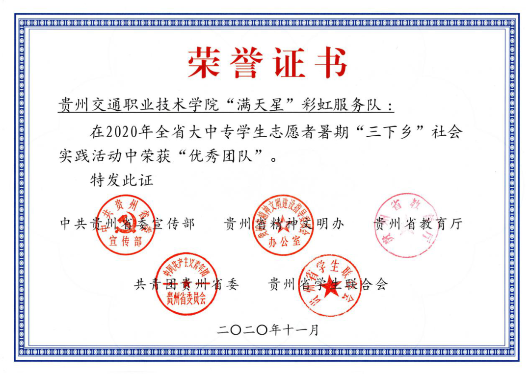 除了提供防疫志愿服务,学院的志愿者们还积极投身到暑期“三下乡”社会实践活动中,去年暑假,在学院团委的组织下,“满天星”彩虹志愿服务队深入到从江县、晴隆县、遵义市播州区、贵阳市清镇市、长顺县等五个区县的7个地区开展包括乡村振兴、新时代文明实践、七彩假期等在内的各类志愿服务和实践活动。他们以青春作桨,以梦想为帆,在当地帮扶刺绣产业、消除视觉贫困、关爱空巢老人和留守儿童,受到了当地媒体的高度关注。“满天星帮扶幸福成长,骄行者助力脱贫攻坚”也因此受到了省委宣传部、省精神文明办、省教育厅、共青团省委、贵州省学生联合会的表彰,“满天星”彩虹服务队荣获了2020年全省大中专学生志愿者暑期“三下乡”社会实践活动“优秀团队”。