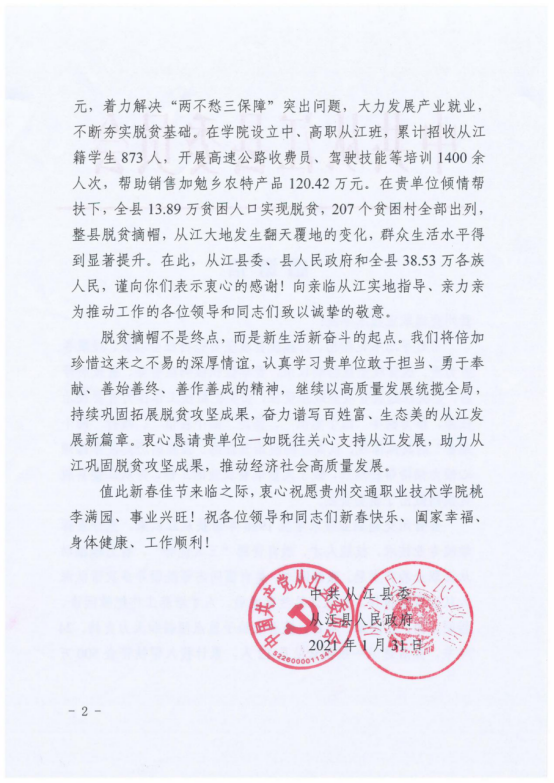近日,从江县委、县政府向学院发来感谢信和牌匾,对学院多年来在从江县的倾心、倾力、倾情帮扶工作表示诚挚的感谢。