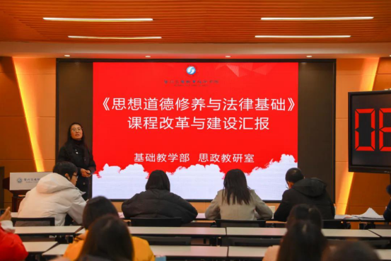 基础教学部的《思想道德修养与法律基础》课程就是本次课改中的一门公共课,据该课改项目负责人熊燕霞介绍:“课改前,学生们普遍认为这门课程大而空,‘不实用、无关痛痒’一直以来都是学生们对这门课程的评价。学生课前基础薄弱、课中学而不思、课后一走了之现象突出。此外,课程内容与专业建设、地方文化、行业文化没有进行很好的融合。”发现这一问题后,以课改为契机,基础教学部思政教研室抽调骨干教师组成了20人的课改团队,从点到面对《思想道德修养与法律基础》课程进行全方位的改革。“我们立足职业教育的特色,从立德树人的教育初心出发,重构了教学、课程内容和教学方法与手段三大目标,采取了‘课堂教学+实践教学+网络教学’的混合式教学模式,期望通过该课程的学习,帮助学生尽快适应大学生活,培养学生积极的人生态度和正确的人生观、价值观”,熊燕霞介绍。