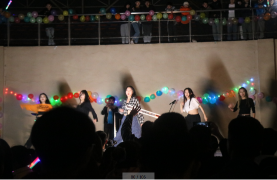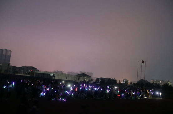 在主持人激昂的开场白后,电音搭配街舞的开场炒热现场气氛,欢快热闹的旋律回荡在润园运动场的上空。台下密密麻麻的观众们挥舞着手里的荧光棒,呼喊声如浪花般起伏,动感的爵士舞表演将整个活动推向高潮。