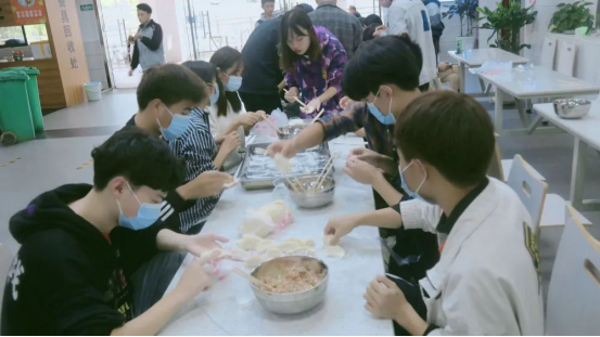 在食堂后厨,同学们与食堂叔叔阿姨认真地准备馅料,在就餐处,同学们积极准备着包饺子所需的物品。一切准备就绪后,馅料端上了每张餐桌。老师和同学们因为这个特殊节日相聚在一起,共同分享着学院的温暖。