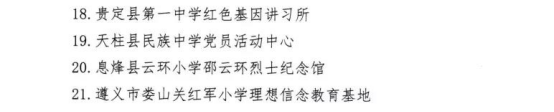 近日,省委教育工委、省教育厅发布《关于贵州省教育系统“理想信念教育基地”申报评审结果的公示》,经专家通过网络初审、实地考察、召开评审会等,共21家单位拟被评选为为教育系统“理想信念教育基地”。