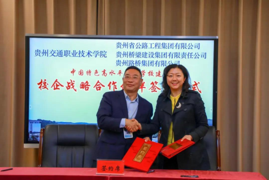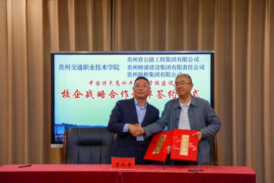 9月23日下午,学院举行中国特色高水平高职学校建设校企战略合作伙伴签约仪式,与贵州省公路工程集团有限公司、贵州桥梁建设集团有限责任公司、贵州路桥集团有限公司分别签署战略合作协议。