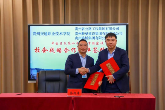 贵州省公路工程集团有限公司党委副书记高绚、贵州桥梁建设集团有限责任公司副总经理母进伟、贵州路桥集团有限公司党委副书记崔文武,贵州交通职业技术学院党委副书记、院长吴有富,副院长刘志、刘正发、田兴强出席会议。签约仪式由田兴强主持。