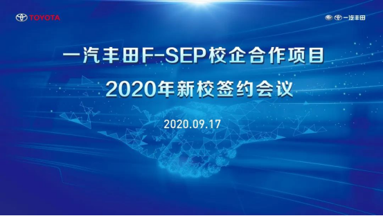 9月17日下午,FTMS一汽丰田项目组与学院举行F-SEP项目签约仪式,受疫情影响,此次签约仪式以大屏互动“云签约、云授牌”形式开展。