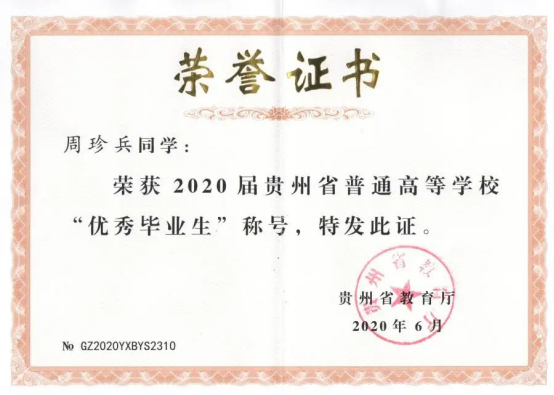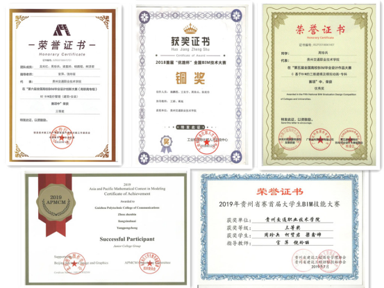 三年里,周珍兵曾任班级班长。在校期间荣获院级三好学生、省级三好学生、院级二等奖学金、首届“优路杯”BIM应用技能大赛铜奖、贵州省首届大学生BIM技能大赛三等奖、全国高等院校BIM应用技能大赛团队三等奖,其中“BIM5D”专项一等奖、第六届全国高校BIM毕业设计创新大赛三等奖、2019年亚太地区数学建模大赛优秀奖等奖励。