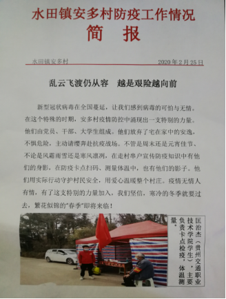 信中高度表扬了学院建筑工程系测量专业31816班同学匡治杰,在疫情蔓延全国时,他志愿参加当地疫情防控工作,用行动守护村民安全,用爱心温暖了村庄。