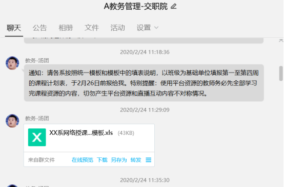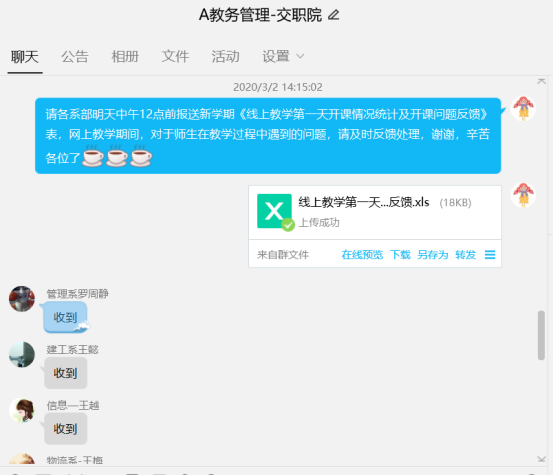 学院成立了以教学副院长为组长,教务处、质控办负责人为副组长、各系部主任为成员的线上教学工作组,全面负责学院线上教学工作的组织、指导、监控和评价。每天收集当天开课情况及问题反馈,并及时联系网络平台技术员,及时解决出现问题。