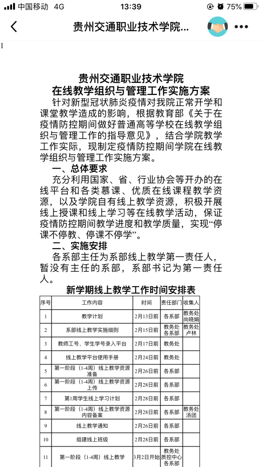按照《贵州交通职业技术学院在线教学组织与管理工作实施方案》的部署,2月14日前,各系部已编写了线上教学实施细则、线上教学计划等内容,2月26日前,全体同学在正式线上教学前已提前学习了线上学习方法,任课教师也完成了在教学平台上开设课程、组建班级、教学资源上传等工作。