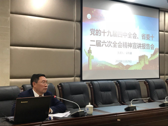11月29日,学院党委副书记、院长吴有富在清镇校区对学院中层以上干部及学院办公室、成教部、物流工程系全体党员宣讲党的十九届四中全会及省委十二届四次全会精神,并开展党风廉政建设约谈。