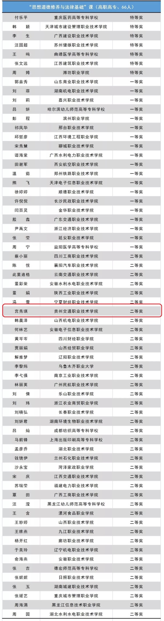 在首届全国高校思想政治理论课教学展示活动中,我院基础教学部教师宫秀琪获“思想道德修养与法律基础”课高职高专组二等奖。