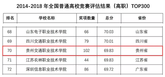 其中,在2014—2018年全国普通高校竞赛评估结果(高职)TOP300、2018年全国普通高校竞赛评估结果(高职)TOP100中,贵州交通职业技术学院均榜上有名!
