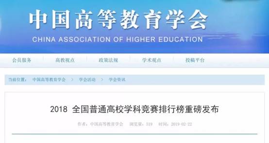 2月22日,中国高等教育学会在杭州正式发布2014-2018 年中国高校创新人才培养暨学科竞赛评估结果。本次共发布 12 个高校学科竞赛评估结果榜单。