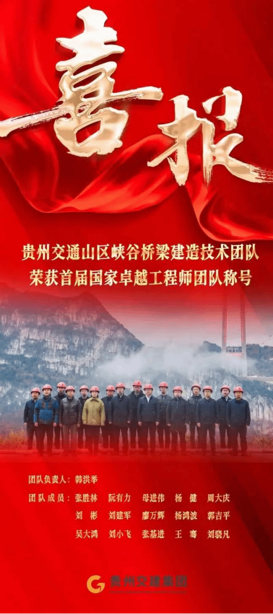 1月19日,“国家工程师奖”表彰大会在人民大会堂举行,依托贵州交建集团组建的贵州交通山区峡谷桥梁建造技术团队荣获“国家卓越工程师团队”称号。