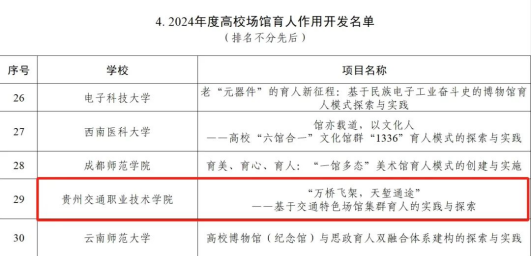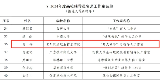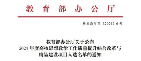 近日,教育部公布了2024年度高校思想政治工作质量提升综合改革与精品建设项目遴选结果,学院总共2个项目入选。其中“‘万桥飞架,天堑通途’——基于交通特色场馆集群育人的实践与探索”获批2024年度高校场馆育人作用开发典型案例,“‘星火锦年’名辅导员工作室”获批2024年度高校辅导员名师工作室。据悉,全国入选2个项目的高职院校仅8所。