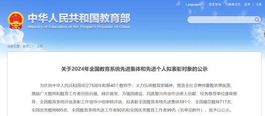 近日,教育部公示2024年全国教育系统先进集体和先进个人拟表彰对象,我校教师王转拟获全国优秀教师表彰。