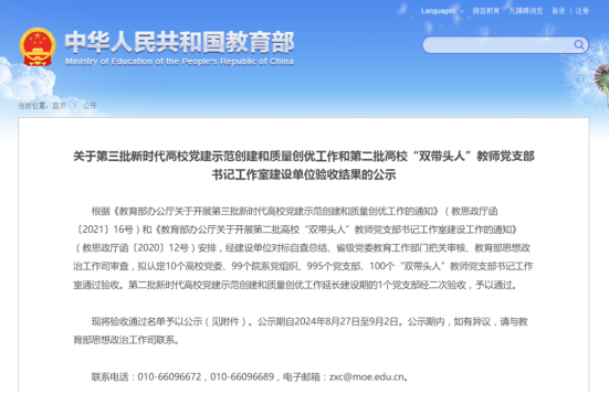 近日,教育部发布《关于第三批新时代高校党建示范创建和质量创优工作和第二批高校“双带头人”教师党支部书记工作室建设单位验收结果的公示》,我校管理工程系教工学生党支部顺利通过验收。