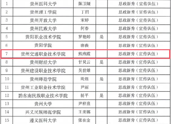熊燕霞,思政课发展创新研发中心负责人。她以“葆本色、强底色、促特色、添亮色”为抓手,推动党建工作、宣传思想工作与教育教学业务相融合,高质量推进铸魂育人,先后荣获贵州省直机关“文明标兵”、贵州省直机关学习型党员等荣誉称号5项。