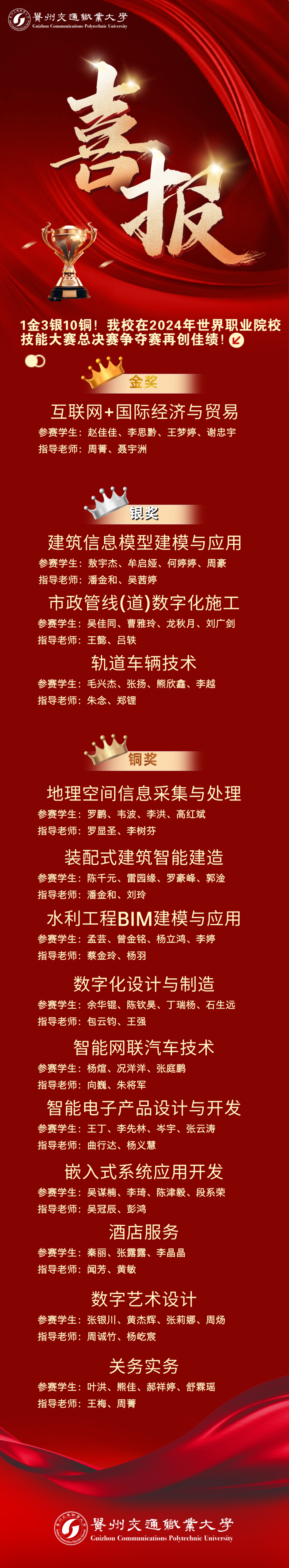 近日,2024年世界职业院校技能大赛总决赛争夺赛多个赛项陆续落下帷幕,我校在本次大赛中取得骄人成绩,斩获1金3银10铜共14个奖项!