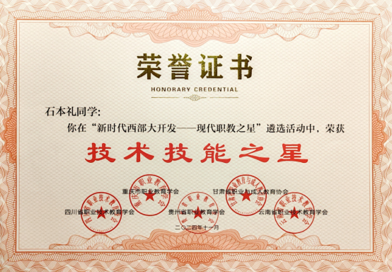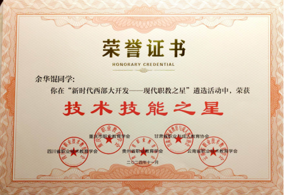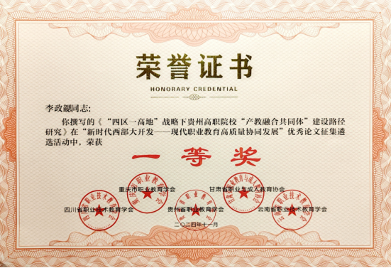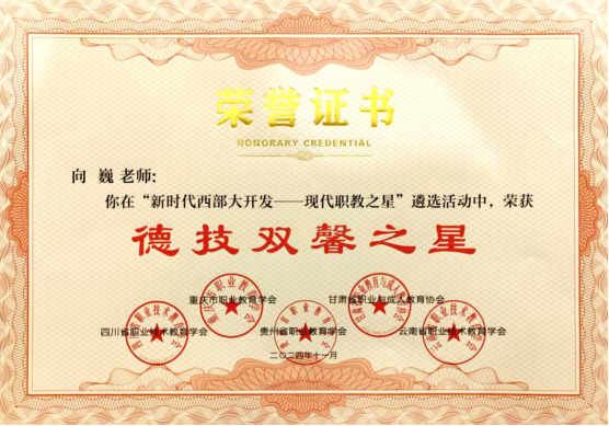 会议为荣获“西部五省市‘现代职教之星’”的单位和个人进行了颁奖。我校被评为“‘创新发展之星’职业院校”;我校教师向巍、王转被评为“‘德技双馨’教师”;我校学生余华馄、石本礼被评为“‘技术技能之星’学生”;我校教师李政勰撰写的论文《“四区一高地”战略下贵州高职院校“产教融合共同体”建设路径研究》荣获“新时代西部大开发——现代职业教育高质量协同发展”优秀论文集征集遴选活动一等奖。