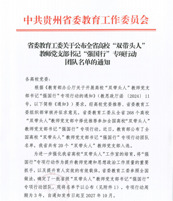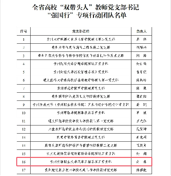 近日,省委教育工委印发了《关于公布全省高校“双带头人”教师党支部书记“强国行”专项行动团队名单的通知》,我校汽车工程系教工党支部成功入围全省高校“双带头人”教师党支部书记“强国行”专项行动团队名单。