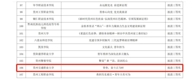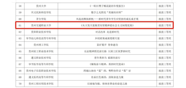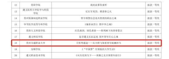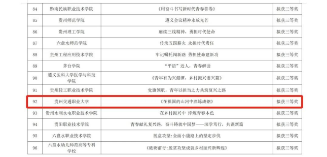 近日,在团省委举办的2024年贵州省高校团支部“微团课”竞赛中,经校级竞赛作品推报、省级初赛网络评审和决赛专家现场评审,我校“微团课”作品《天堑变通途——从万桥飞架看青年挺膺担当》拟获一等奖!《从大发天渠脱贫攻坚精神看社会主义制度优势》《在祖国的山河中淬炼成钢》《青春,奋斗正当时》拟获三等奖!本次竞赛我校推荐的四个作品均获奖项肯定!