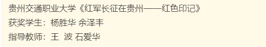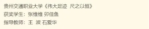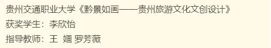在由贵州省委教育工委、省委宣传部、省教育厅、省精神文明办、省委网信办、省广播电视局、团省委联合举办的第十九届“多彩校园·闪亮青春”全省校园文化活动月中,我校同样喜获佳绩,《黔景如画——贵州旅游文化文创设计》《红军长征在贵州——红色印记》《伟大足迹 尺之以恒》三个作品在“多彩创意·助力黔行”全省大学生文化创新设计大赛中荣获三等奖!