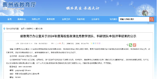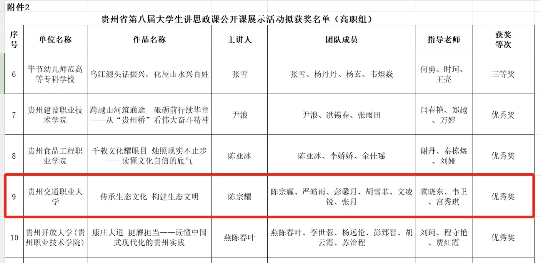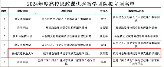 近日,省教育厅公布了贵州省2024年度高校思政课优秀教学团队、科研团队拟入选名单和2024年度高校思政课优秀教学团队拟立项名单,我校马克思主义教学部教师熊燕霞主持的“校内特色场馆赋能思政课实践教学团队”拟获贵州省2024年度高校思政课优秀教学团队立项;冀晓东、韦卫、宫秀琪指导,路桥工程系学生陈宗耀主讲的作品《传承生态文化 构建生态文明》拟获第八届大学生讲思政课公开课展示活动优秀奖。