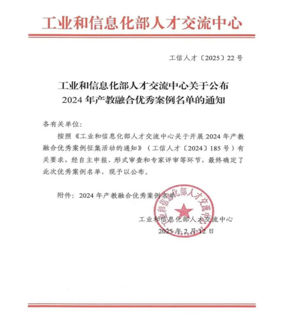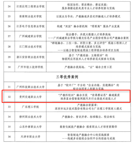 近日,工业和信息化部人才交流中心发布《关于公布2024年产教融合优秀案例名单的通知》,面向全国院校、企业、科研院所、行业组织等评选出60个优秀案例。我校《“产教科创训”融合互促 “岗课赛证思”融通提质培养复合型智能网联汽车行业高技术技能人才》案例成功获选优秀案例三等奖。