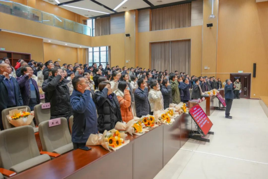 在刘正发的带领下,全体新入职教师进行了庄严宣誓,紧握高举的右拳,铿锵坚定的誓言,是每一位新入职教师的自我期许,更是他们对投身教育事业的庄严承诺。