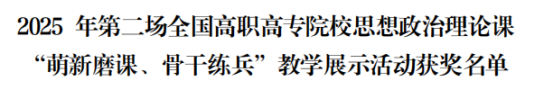 近日,全国高职高专院校思想政治理论课建设联盟公布了2025年第二场全国高职高专院校思想政治理论课“萌新磨课、骨干练兵”教学展示活动获奖名单,我校马克思主义教学部刘旭老师凭借扎实的理论功底和创新的教学设计荣获全国二等奖,展现了我校思政课教师队伍良好的政治素养和业务能力。