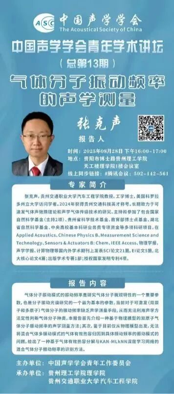 8月28日下午,汽车工程学院教师张克声教授受中国声学学会青年工作委员会邀请,在贵州理工学院为中国声学学会“青年学术讲坛”(总第13期)作题为《气体分子振动频率的声学测量》的专题报告。