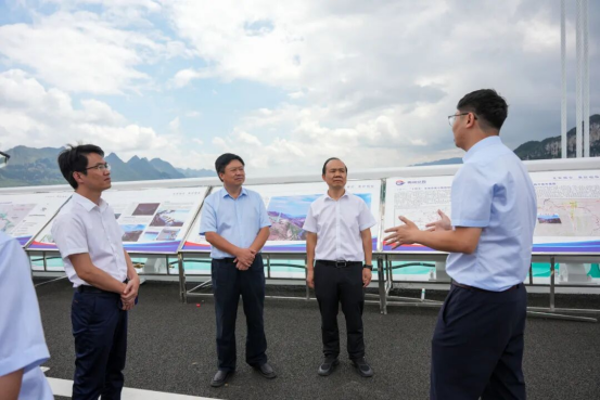 “把大桥建成交通枢纽,更要建成文旅名片。”在花江峡谷大桥云渡服务区,我校交旅融合协同创新中心负责人张晓松教授向何兴发、刘雁解读“桥遇三叠纪,云渡古海洋”的主题创意区设计与展示工作。团队将大桥自然风光与三叠纪古海洋遗迹结合,创意设计了雕塑作品“会飞的石头”“卡吡嘟”卡通雕塑形象及三叠纪古海洋3D艺术墙绘等,以艺术设计赋能桥梁文化,进一步提升峡谷大桥的品牌影响力与科普研学旅行内涵。在服务区工地现场,调研组还查看了“海洋波纹”铺装、古生物化石展陈施工情况,大家认为将交通功能与自然和在地文化资源深度绑定的设计理念,是学校服务区域经济发展的重要实践。