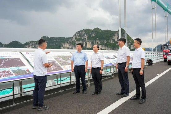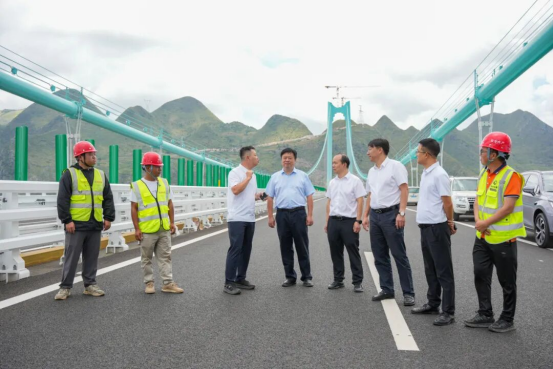 2025年8月28日,贵州交通职业大学党委书记何兴发、校长刘雁、党委副书记杨再豪、副校长吴薇及相关部门负责人,赴即将于9月底通车的花江峡谷大桥考察调研。这座“横竖”都是世界第一的大桥,全长2890米,主桥跨径1420米,桥面到水面高度625米;建成后,其主桥跨径居山区桥梁跨径世界第一,桥梁高度居世界第一。调研组一行慰问了参建毕业生代表,实地考察了学校科研成果转化、社会服务落地情况,在625米高空之上,亲身感受学校以科研突破、社会服务、校友担当为核心的“贵州交职大力量”。