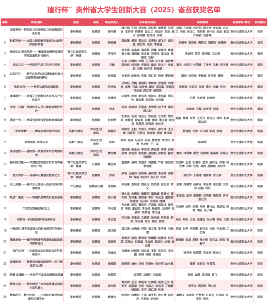 近日,省教育厅公布“建行杯”贵州省大学生创新大赛(2025)省赛获奖名单,经网络评审和现场决赛,共评出金奖161项、银奖368项、铜奖971项,我校学子凭借扎实的专业素养、活跃的创新思维、出色的实践能力,斩获金奖2项、银奖7项、铜奖16项。