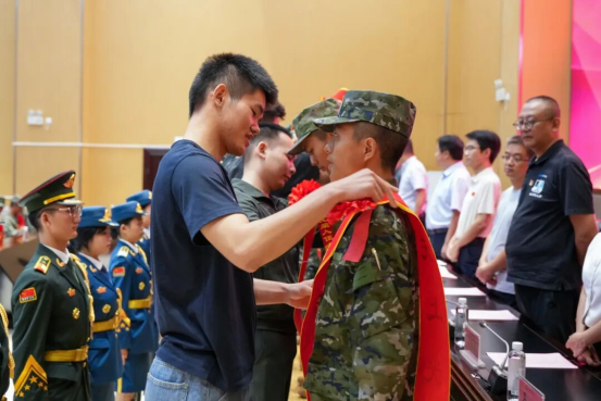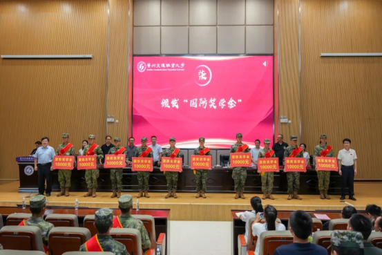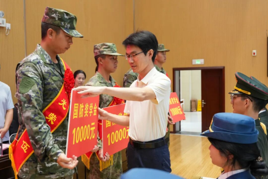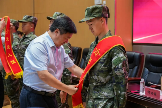随后学校领导和退役士兵代表分别为新兵佩戴绶带与光荣花。学校党委书记何兴发、党委副书记杨再豪共同为入伍新兵代表颁发“国防奖学金”,勉励他们牢记使命、报效国家。