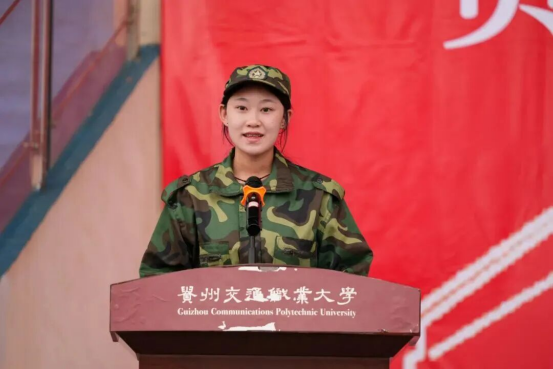 2025级参训新生、水运与航空学院学生杨淑钰作为参训新生代表发言,她号召全体新生要牢记纪律,规范言行,以认真的态度对待训练,以坚韧意志克服困难,以友善之心互帮互助,在军训中领悟责任意识、协作能力和精益求精的工匠精神,以拼搏的姿态展现交职大学子的风采。
