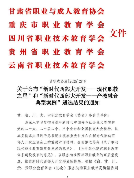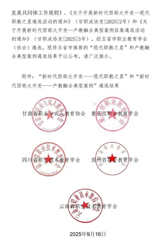 据悉,本次遴选是由甘、渝、川、贵、云五省职业教育学会共同组织,对各职业院校在党的建设、校企合作、服务国家重大发展战略、产教融合、人才培养质量、队伍建设、特色文化建设、“三教改革”、数字化转型等九个方面的办学实力进行综合评估。遴选范围包括五省市所有职业院校,遴选结果在西部地区具有较高的社会认可度和影响力。
