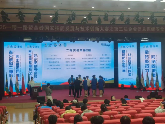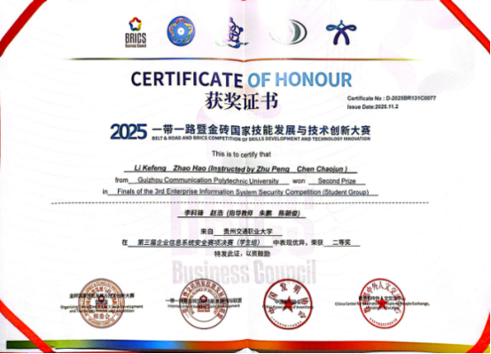 11月2日,2025“一带一路”暨金砖国家技能发展与技术创新大赛——第三届企业信息系统安全赛项全国总决赛在山东理工职业学院圆满闭幕。本次决赛汇聚了全国各地的76支精英队伍,由我校智慧交通学院网络与信息安全微专业朱鹏、陈朝俊老师指导,李科锋、赵浩同学组成的参赛队凭借出色发挥,斩获国赛二等奖。