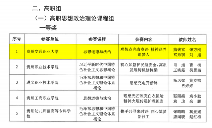 近日,2025年贵州省职业院校技能大赛教学能力比赛获奖名单正式公布。马克思主义学院熊钱富、张方刚、宫秀琪、刘旭四位教师组成的《思想道德与法治》教学团队荣获高职思想政治理论课程组一等奖,充分展示了我校在思想政治理论课教学改革方面的显著成效。