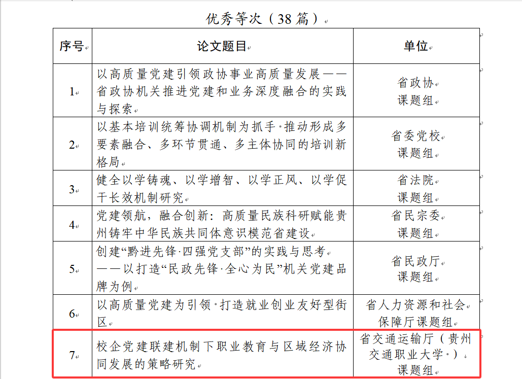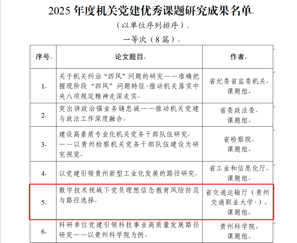 近日,省直机关工委对2025年度机关党建优秀课题研究成果进行通报,我校选报的课题《数字技术视域下党员理想信念教育风险防范与路径选择》获一等奖;《校企党建联建机制下职业教育与区域经济协同发展的策略研究》获优秀奖。