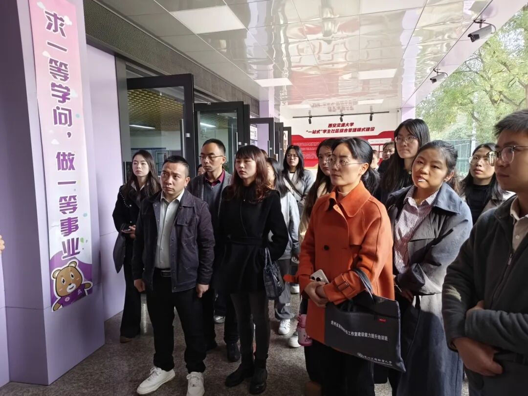 现场研学环节,学员们走进西安交通大学“一站式”学生社区、陕西科技大学“萌哥有话说”辅导员专业化引领工作室、西安工程大学“一站式”数智新“+”工作室,直观感受思政工作与学生生活深度融合的创新模式,深入学习辅导员工作室建设模式与学生社区育人机制。