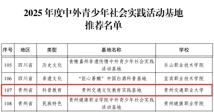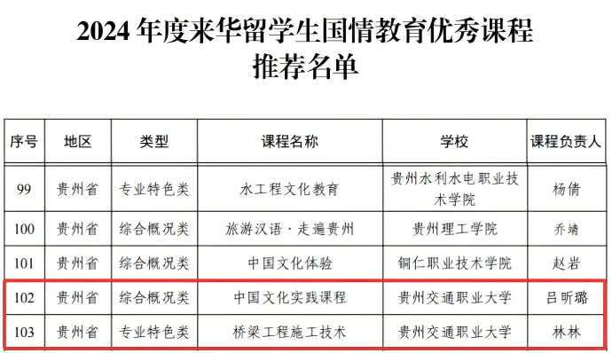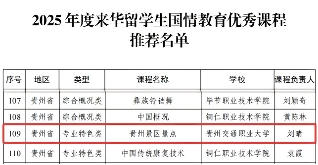 近日,中国教育国际交流协会受教育部国际合作与交流司委托,公布了2025年度“了解中国”优秀课程与“中外青少年社会实践活动基地”推荐名单。该评选旨在深入贯彻《教育强国建设规划纲要(2024-2035)》精神,落实《加强来华留学管理工作方案》部署,本年度面向全国高校征集并择优推荐100门优秀课程与100个实践基地。在此次评选中,我校申报的专业特色类课程《贵州景区景点》成功入选优秀课程推荐名单,申报的“贵州交通文化教育实践基地”成功入选实践基地推荐名单,实现了在该国家级项目中的“课程”与“基地”双线突破。