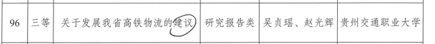 近日,贵州省第十六次哲学社会科学优秀成果奖评选结果揭晓,我校物流工程学院教师吴贞瑶凭借创新性研究成果《关于发展我省高铁物流的建议》成功获评入选,为学校人文社科领域再添殊荣。