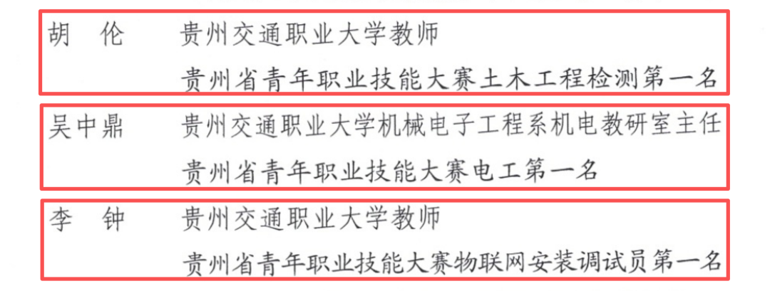近日,贵州省总工会发布《2024年度省级一类职工职业技能竞赛授予贵州省五一劳动奖章名单》,我校胡伦、吴中鼎、李钟三位教师凭借精湛的专业技能与优异的赛场表现,被授予“贵州省五一劳动奖章”称号。