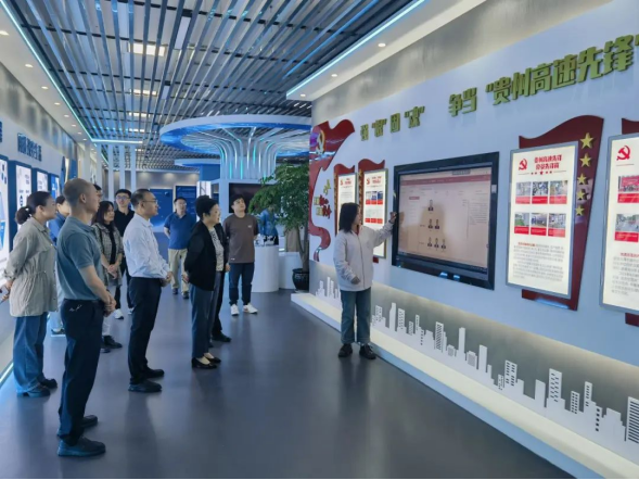 张静一行现场参观了贵州高速集团云控中心(中南交科公司科技展厅)。结合主题教育调研领题“贯彻落实新时代党建总要求,提升学院基层党建工作质量”,重点听取了公司关于贵州高速先锋·智慧党建数字化管理平台的相关介绍,校企在座谈会上就数字赋能党建进行了交流探讨。