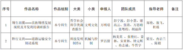 根据团中央、团省委关于开展第十八届“挑战杯”全国大学生课外学术作品竞赛作品申报工作的有关通知及安排,经过经校内选拔赛、省赛评审,我院拟推报以下两件作品参加第十八届“挑战杯”全国大学生课外学术作品竞赛,现公示如下: