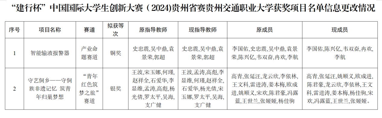 根据《省教育厅办公室关于举办贵州省中国国际大学生创新大赛(2024)的通知》文件精神,为确保所有参与者的权益得到妥善处理,学校对《智能输液报警器》、《守艺侗乡——守侗族非遗记忆 筑青年归巢梦想》项目进行了修改、排序,现将修改后获奖信息予以公示,公示期为2024年9月4日——2024年9月6日。