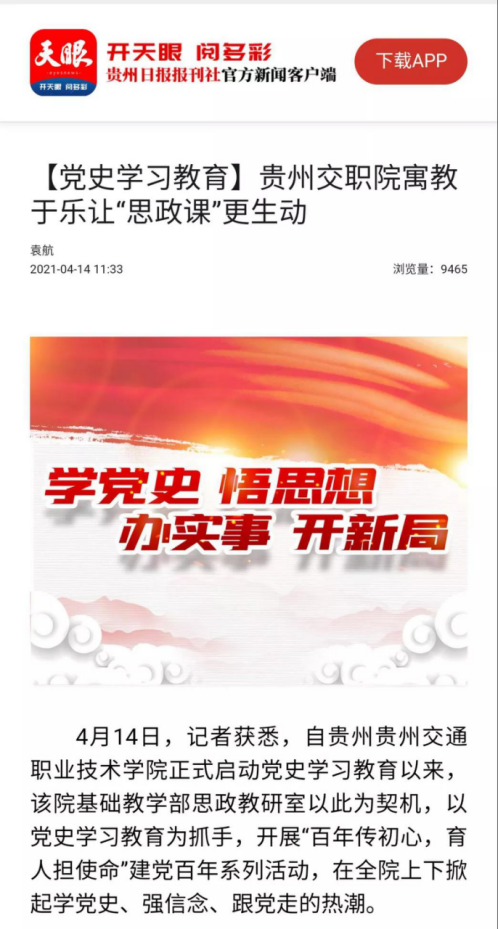 4月13日,学院官方微信公众号报道了我院创新党史学习形式的新闻,文章一经发出,受到了各级媒体的关注。新华社、天眼新闻、众望新闻、动静新闻等国家级和省级媒体纷纷转发,截至目前,阅读量已累计突破了32万。